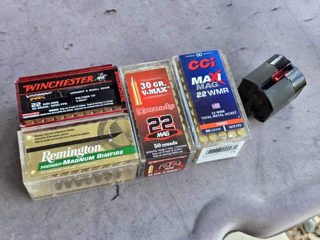 Subsequent accuracy testing was done with Winchester Varmint HP, a polymer tip 30-gr V-MAX load, Remington Premier Magnum Rimfire with a 33-gr AccuTip-V bullet, Hornady 22 MAG 30-gr V-MAX, and CCI’s 40-gr TMJ Maxi Mag load.
