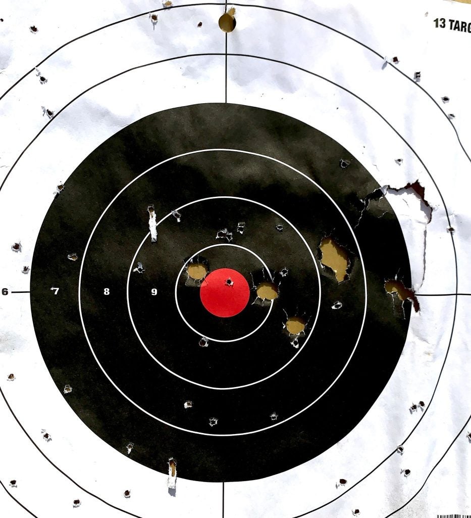 Here’s something to think about…. I have a small, round steel target that hangs about 20 yards in front of my shooting bench, off to the side. I was curious, so I grabbed the gun and parked about 15 yards out. I aimed and shot, and hit it more often than not. I was pleasantly surprised that this close-range, “get-off-me” gun could ring steel that far away.