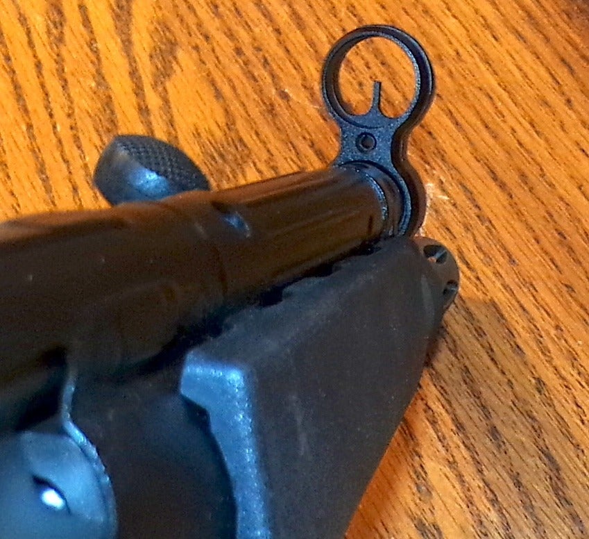 This is no bargain-bin cheapie. The gun, as I mentioned above, is made on actual H&K machinery and shares some features with the original. We have the classic wide handguard and rear sight, with its rotating “drum” and four apertures.