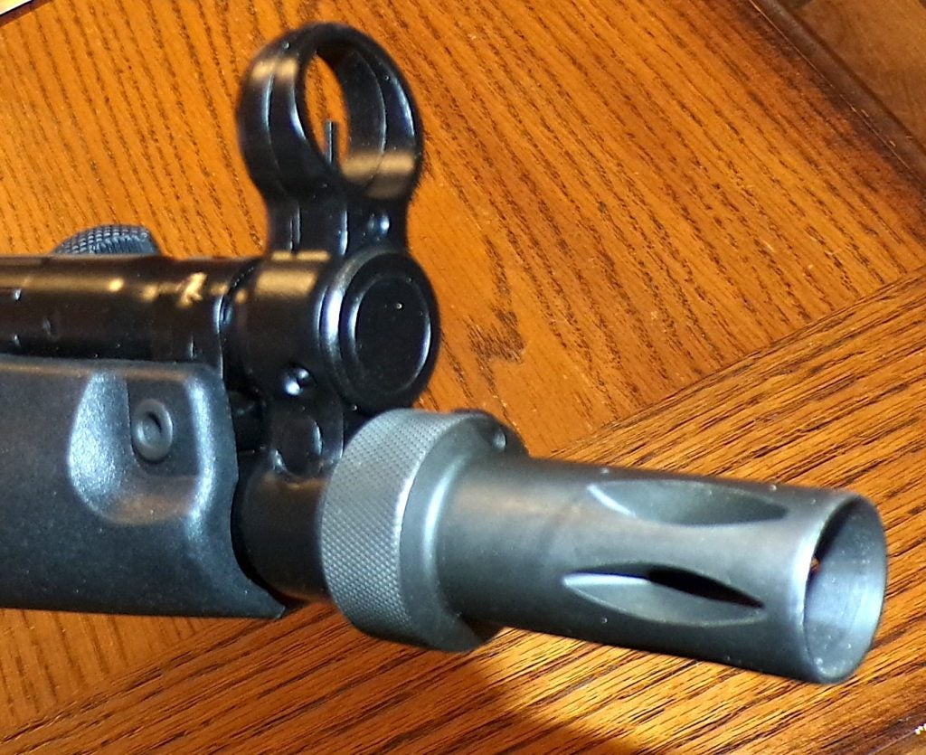 Another shot of the flash hider. If you wish, you can remove it and add a 9mm-rated suppressor using its 1/2×28 threads.