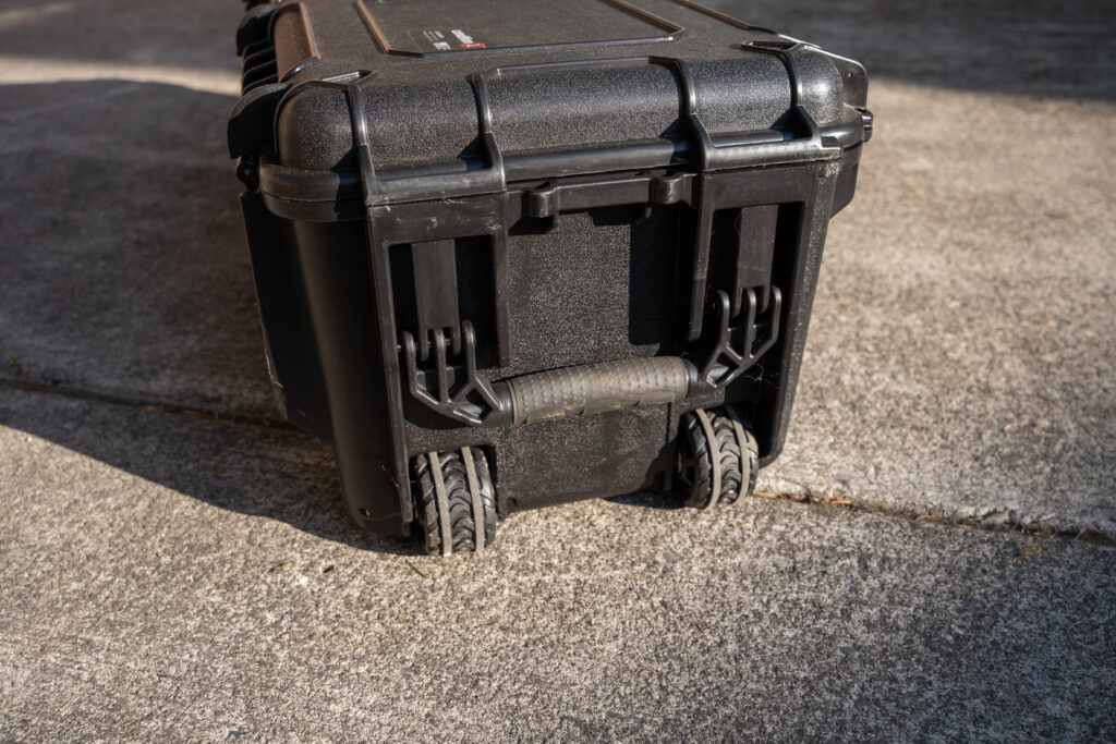 To help move this thing around, one side has a robust set of wheels to pull the case as needed. Overall size is just right for what the case offers- the outside dimensions are 44.52″ X 16.30″ X 12.90″, making it perfect to fit in the back of most vehicles.