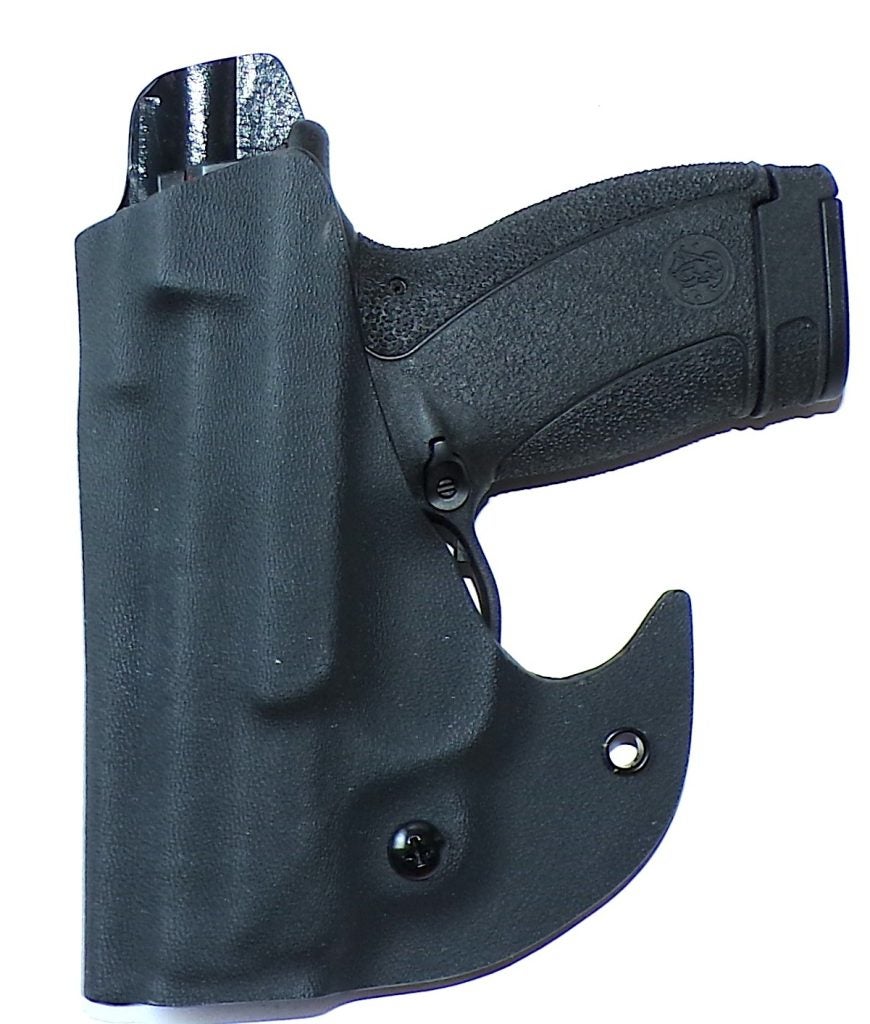 Thumb Push Draw – A thumb push inside the pocket against the exposed Kydex edge on the left side of the handgun allows the firearm to be drawn directly from the pocket while the holster remains in place.