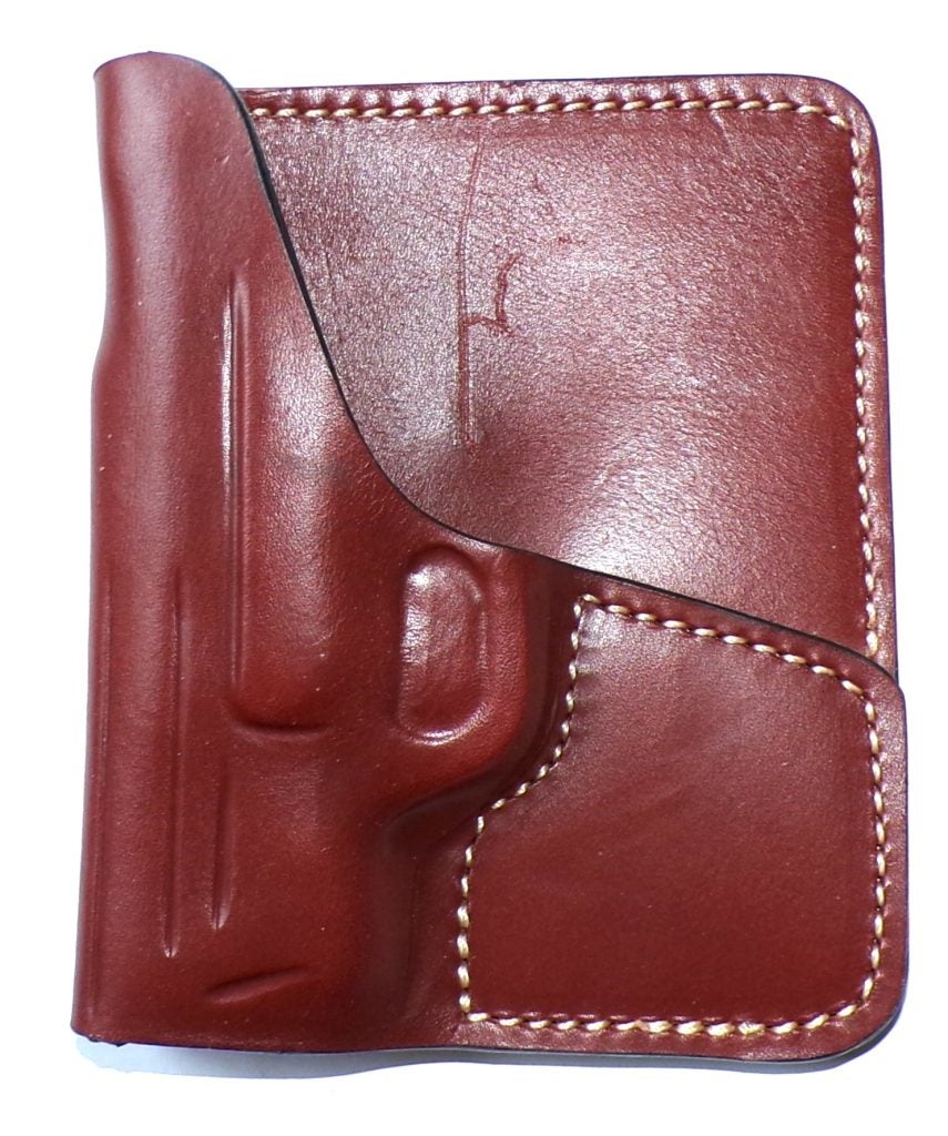 They say that they use the finest full-grain leather, which is then hand-shaped and hand-lacquered. The holster resembles a wallet – printing is minimal – and allows the gun to be drawn by a thumb push against the backer.