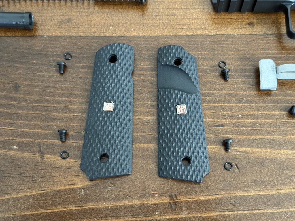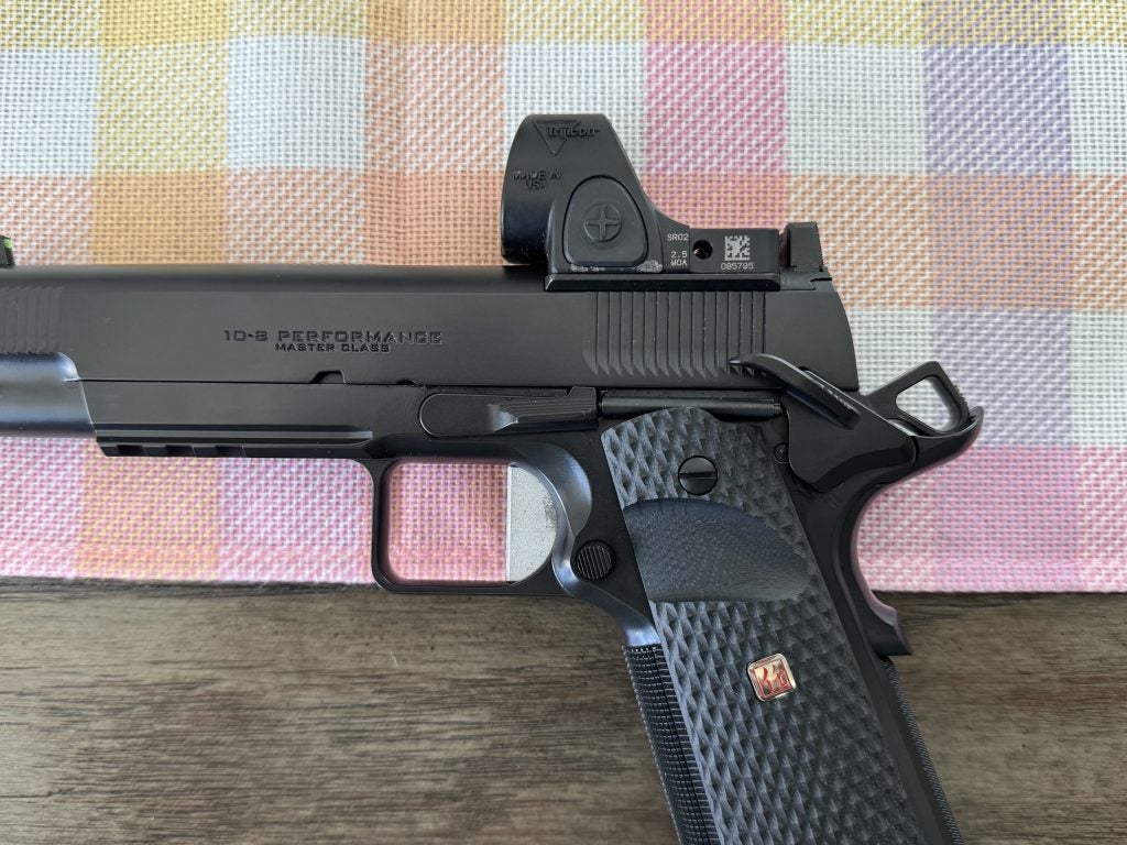 The Master Class also includes almost the complete catalog of 10-8 Performance parts, such as the reverse short guide rod plug, gen 2 slide stop, flat-faced trigger, magazine release, and signature VZ scoop grips with 10-8 medallions. The first iteration of the abbreviated serrations was used on Hilton’s Bravo build.