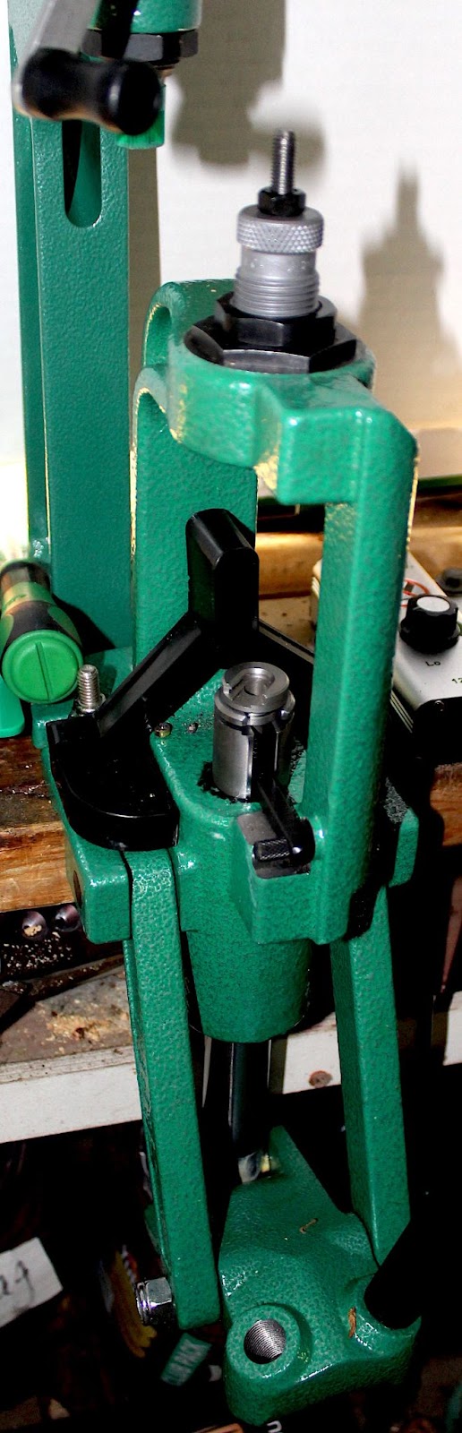(Barely visible in this photo is the replacement primer cup, holding the primer I scrounged up.) I lost the large black pistol priming cup that attaches to the priming arm, which came with the kit. I took the one off my 1978 RCBS Jr. press, and it fit perfectly. Its silver color gives it away. If it ain’t broke, don’t fix it!)
