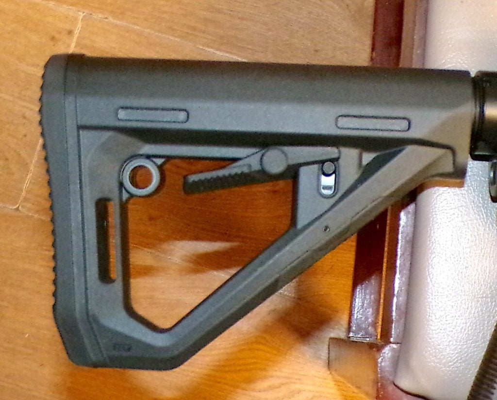 - The lower receiver is fitted with a Magpul MOE-K2 grip and a DT Carbine collapsible buttstock on a Mil-Spec buffer tube.