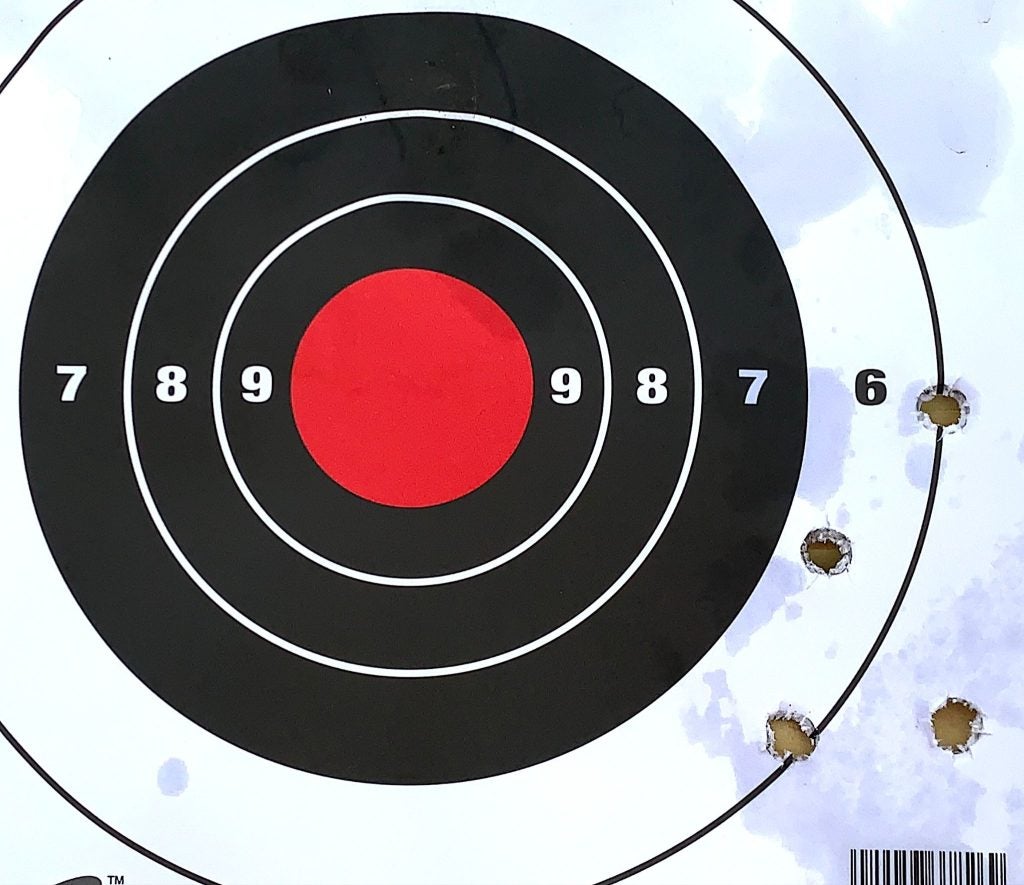 I find that, typically, Black Hills uber-velocity HoneyBadger (no typo) loads to be accurate in whatever caliber I shoot… usually moreso than the “normal” loads. A quick loosening of the rear sight set screw and a bump or two to the left would fix these groups’ center.