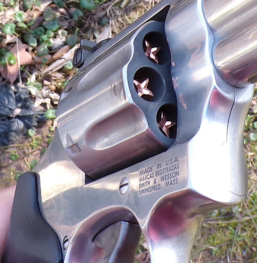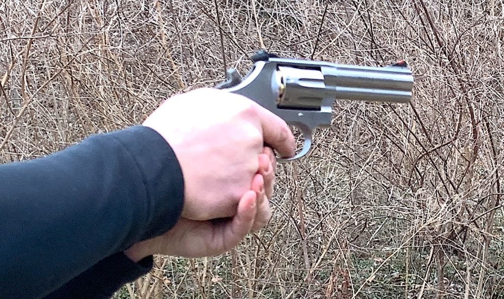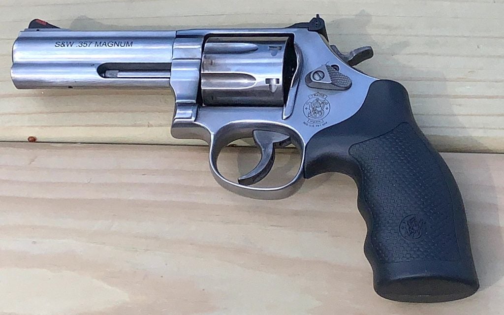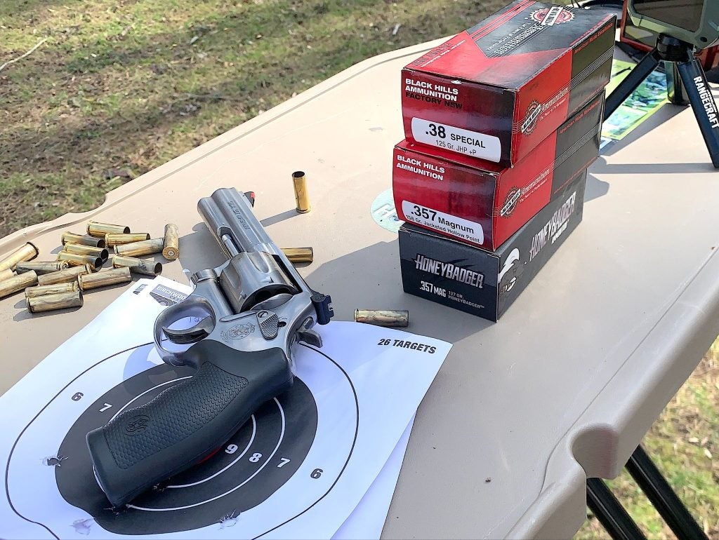 Yet another use for this particular gun has to do with filling your freezer. Here in the Hoosier state, along with many others, a 4-inch .357 is deer-legal. Many deer have fallen because of the “original magnum”. I am an oddball, I know, but sometimes the reloader side of my brain takes over, and I have been known to take squirrels out of tall hickory trees with a hard-cast .357 bullet at middling velocity. They just punch a hole straight through. Anyway, that’s me, but I’m not the only one.