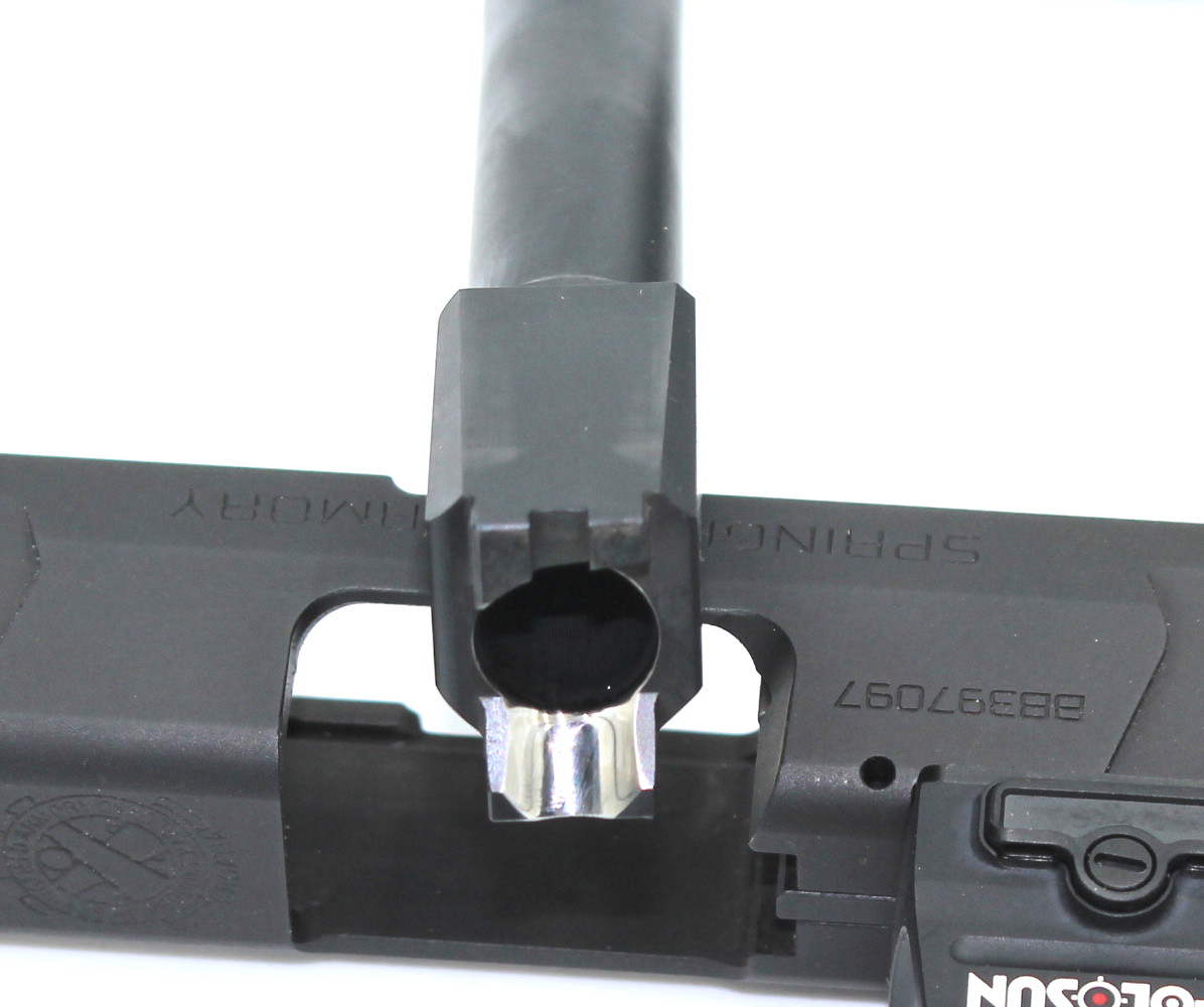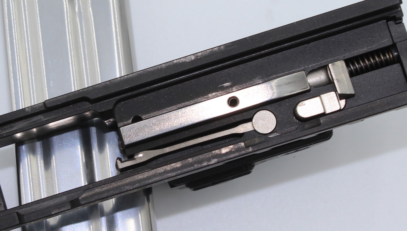 … we see a feed ramp polished to a mirror-like finish. My light box LEDs are reflected in it. And, the match barrel provided plenty of accuracy. The spring is all metal – no plastic here.