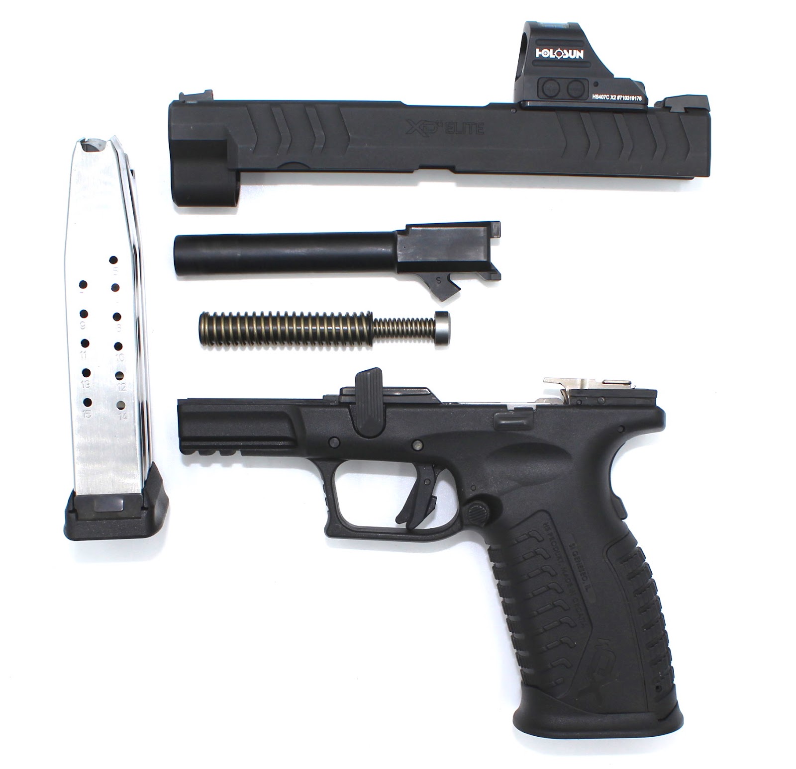 This gun comes apart like most of SA’s striker-fired guns. Clear the chamber and drop the mag. Lock the slide back and rotate the takedown lever upwards 90 degrees. (My Echelon compact lever goes down, not up, so pay attention).