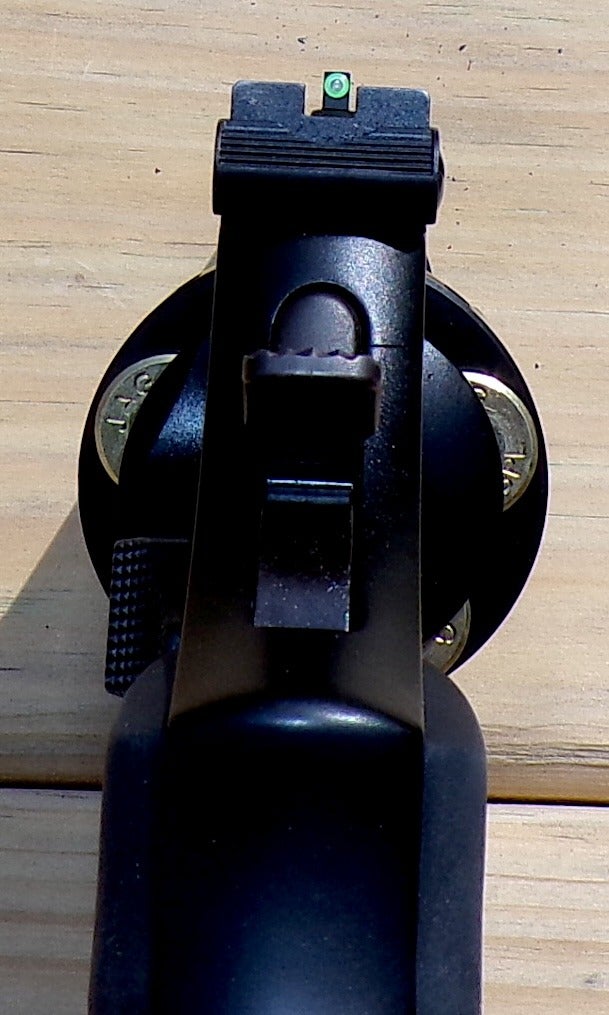 First, the sights. I am well used to the adjustable rear sight that S&W has used for over half a century. It is adjustable, with fine enough “clicks” that allow it to be sighted in for any practical range. The front sight here is a night sight. That should really help with its visibility in dim light.