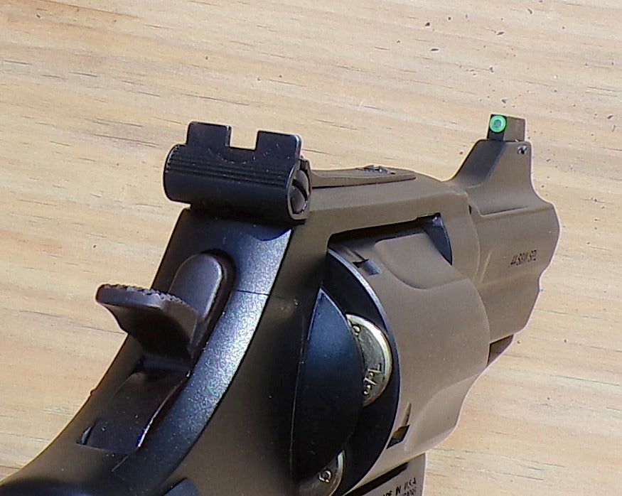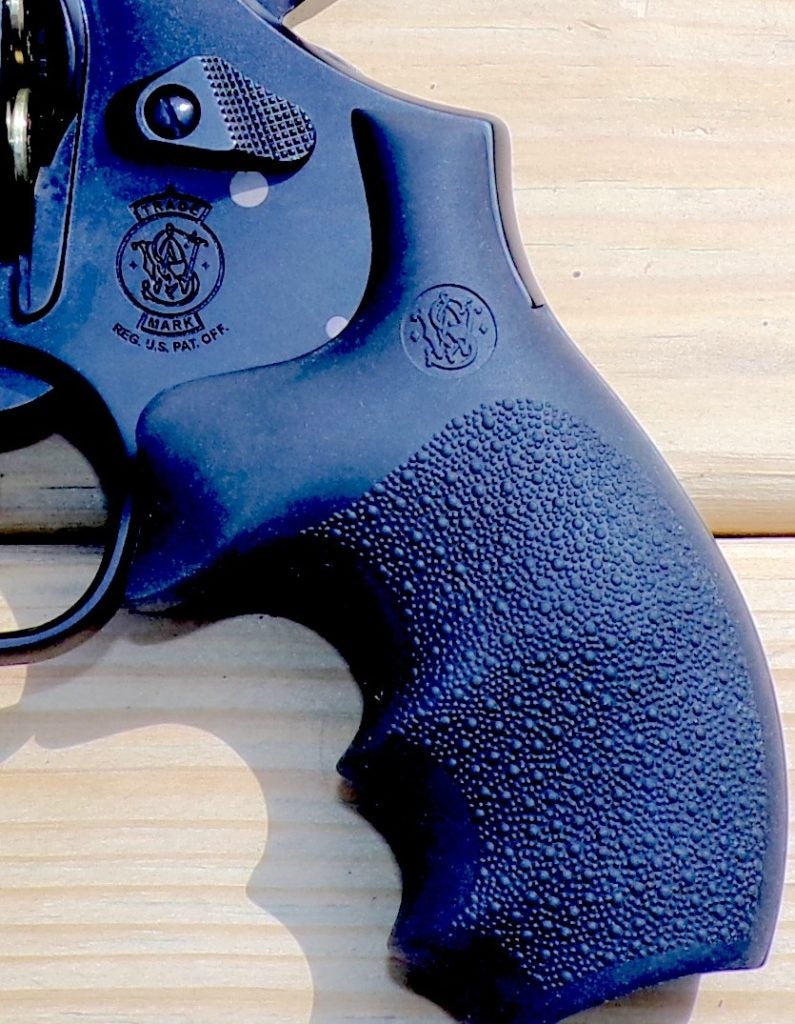 Next, I like the grip. Even Special-variety ammo can have recoil. Don’t think that just because it doesn’t say “Magnum” on the barrel that it won’t bite the hand that holds it. The rubber grip (looks like a Hogue) helps tame recoil to a remarkable extent.