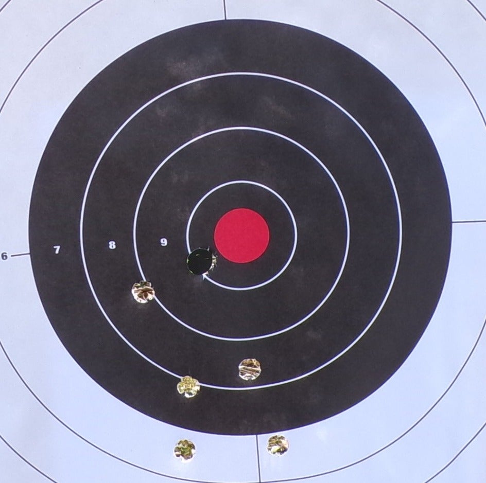 (The black dot at 8:00 is a paster I placed on the target earlier. This gun is a 5-shooter.)