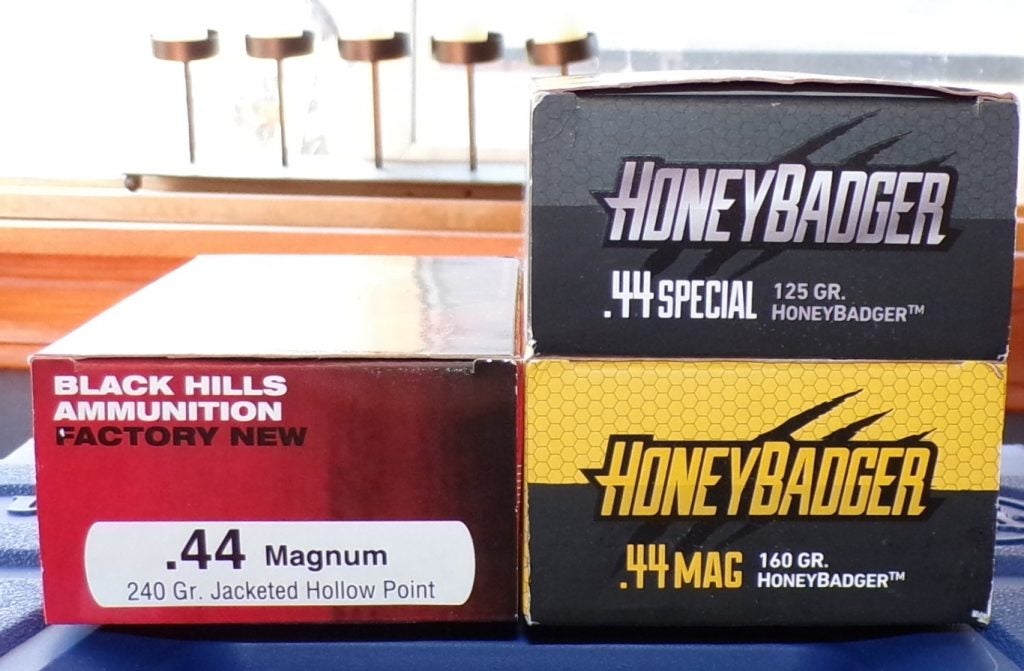 My stash of Black Hills .44 ammo. I just shot a review Ruger Super Blackhawk in .44 magnum with the 240-grain JHP load. Out of the less-than-five-inch barreled SBH, it still clocked 1310 fps. The HoneyBadger will do better, but that’s a different review! Any of these would take a deer at close-to-mid range, from a handgun. Out of my S&W 1854 .44 Magnum lever rifle, the velocities would be off the chain…