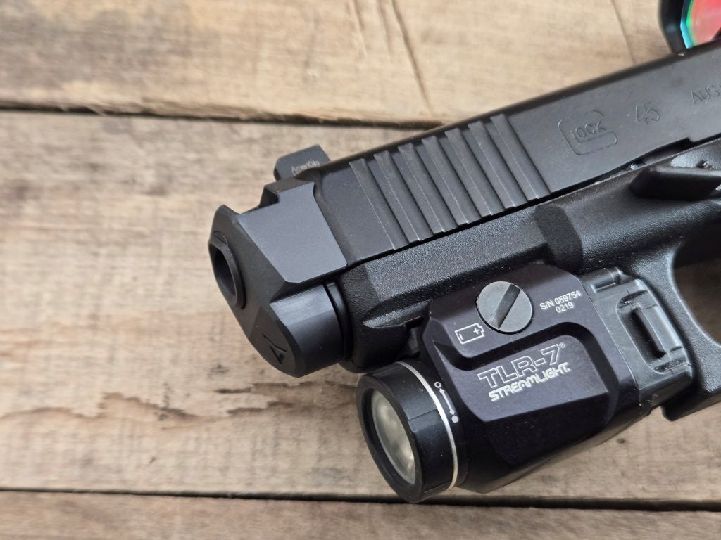 I ran some 124-grain FMJs through initially just to get a feel for the system installed on my work gun. I’ve used this gun the past 8 years, since the Glock 45 came out, so I’m familiar with its normal handling characteristics. When I dropped the Align Tactical thumb rest on in the summer, I saw an improvement in controllability. With the AFTERBURNER, it jumped up another level. The gun shoots amazingly flat, and shot recovery was immediate, particularly in rapid-fire strings. I know a 9mm isn’t exactly a thumper when it comes to recoil or muzzle rise anyway, but there was a noticeable difference compared to shooting the 45 without it. I’ll take that gain.