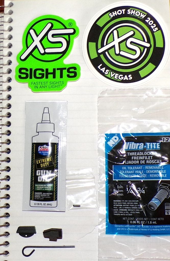 You get the sights, an Allen wrench, a roll pin, Lucas gun oil, and Vibra-Tite thread locker. Plus, several stickers and other inserts are included.