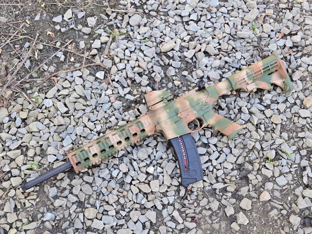 Volquartsen is known for accurate barrels and this one is no exception. I was getting ragged one hole groups out to 25 yards, the most distance I’ve shot my rifle at so far. That’s with my inexpensive TruGlo Tru-Brite open red/green dot sight. I honestly thought about upgrading my optic since I upgraded so much else on my rifle, but decided not to too, at least for now. The TruGlo has worked great on this platform and my boy likes the form factor of the sight. I had actually swapped out at one point for a closed emitter optic and he grumbled about it so I switched back. I was getting exceptional groups from the bench as is so I’m leaving it alone. At further ranges I might benefit from a different, or magnified optic, but this is working for me so far. Plus it’s painted to match the gun.
