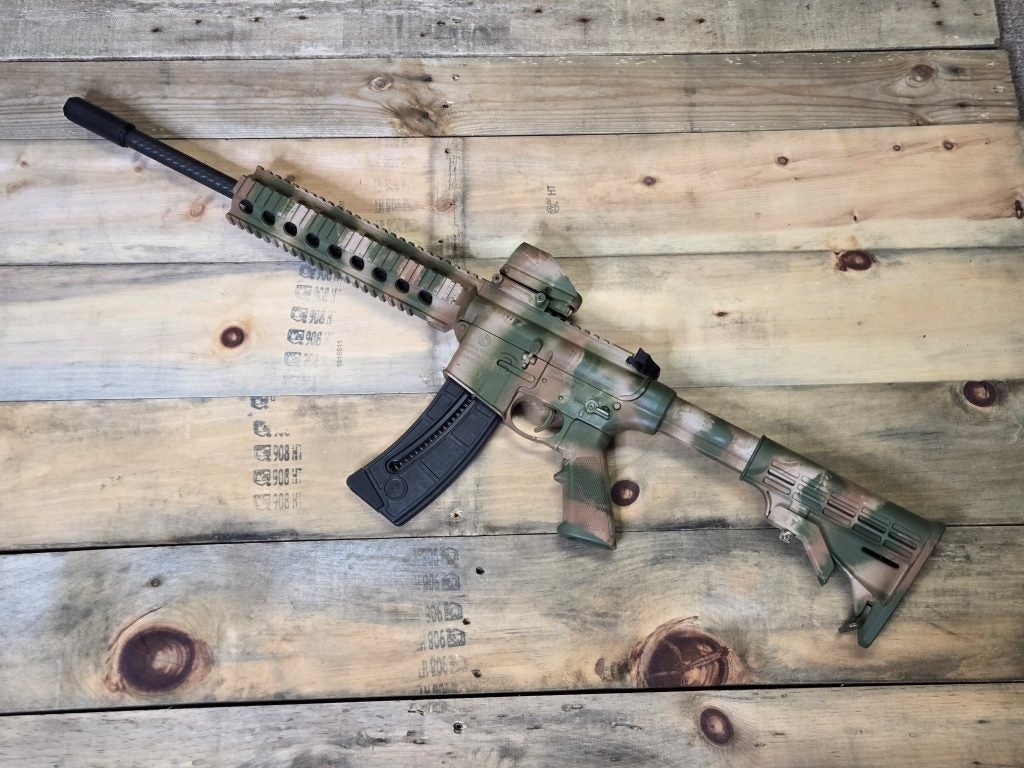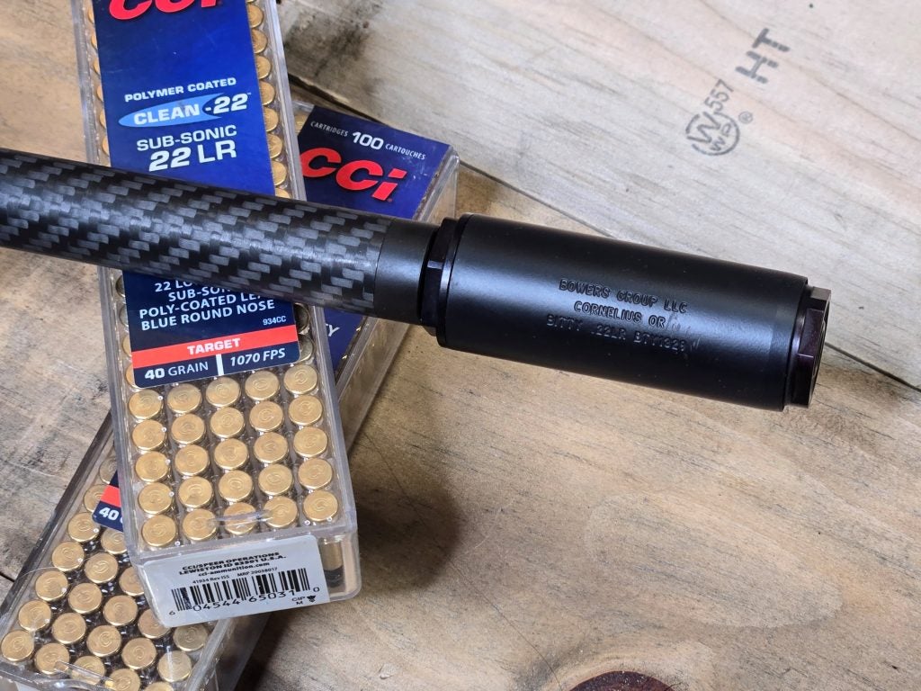 I have a couple options for suppressor use with my 15-22 but one that I found works great is my Bowers Bitty. Most folks associate the Bitty with ultra compact pistols, like the Beretta 20X or similar. It is great for the little guys, but a lot of folks over look that it’s a great rifle can as well. The Bitty is rated for .22LR, .22 Magnum, .22 Hornet, .22 TCM, and 5.7x28mm. It’s also rated for full auto .22 LR so it’s actually perfect for the M&P 15-22 with a binary trigger. I’ve used the Bitty on my Ruger American Rimfire and was really impressed with it on a rifle.